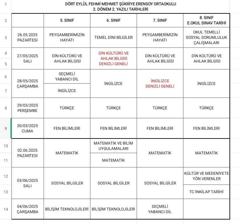 2024-2025 Eğitim Öğretim Yılı 1.Dönem 1.Sınav Tarihleri